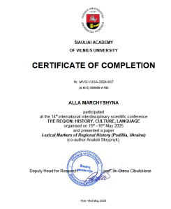 15-16 травня 2025 р. завідувач кафедри англійської мови, проф. Алла МАРЧИШИНА взяла участь у 14-ій міжнародній інтердисциплінарній науковій конференції «THE REGION: HISTORY, CULTURE, LANGUAGE», яка відбувалася у Шауляйській академії Вільнюського університету (м. Шауляй, Литва). Конференція проводилася у змішаному форматі (очно й дистанційно) і транслювалася через платформу міжнародної мережі дослідників RENET (Researchers’ Excellence Network). На пленарному засіданні Алла Анатоліївна виступила онлайн та виголосила доповідь «Lexical Markers of Regional History (Podillia, Ukraine)». Організатори та учасники тепло і схвально зустріли українське представництво, висловили свою підтримку нашому народові у московсько-українській війні та були вражені тим, що під звуки сирен українські науковці й викладачі продовжують працювати з молоддю й проводити дослідження.