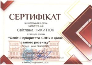 Під час зустрічі було зосереджено увагу на тому, як університетська спільнота може інтегрувати принципи сталого розвитку у всі складники освітнього процесу – від змісту навчальних програм до організації студентського життя. Спікерка наголосила, що якісна освіта є не лише однією з цілей сталого розвитку, а й потужним інструментом для досягнення решти глобальних завдань: економічного зростання, соціальної справедливості та екологічної відповідальності. З науково-педагогічних працівників кафедри участь у семінарі взяла участь старший викладач Світлана Никитюк.