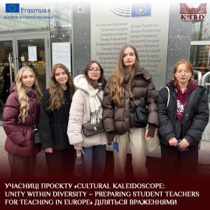 «Участь у проєкті “Cultural Kaleidoscope: unity within diversity” стала для мене важливим професійним досвідом. Тиждень воркшопів зі студентами інших країн дав мені зрозуміти, що справжнє навчання відбувається тоді, коли ми чуємо один одного й готові ділитися власним досвідом без страху, бути не такими, як усі. Після відвідування лекції в Європарламенті я побачила, що співпраця між країнами можлива тоді, коли кожен зберігає свою унікальність і поважає інших. Цей досвід навчив мене цінувати різноманіття й допоміг усвідомити важливість відкритості в професійній діяльності».