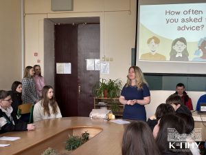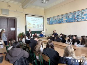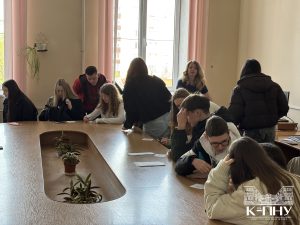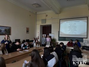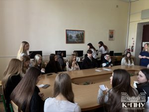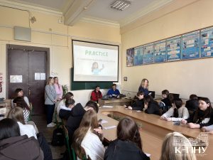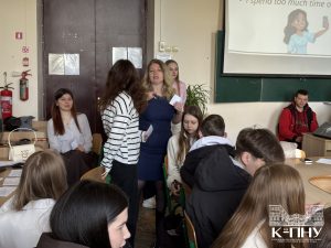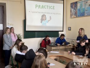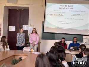 4 квітня в межах тижня англійської мови старший викладач кафедри англійської мови Наталія Фрасинюк провела спільний захід з ліцеїстами 9-Д класу Кам’янець-Подільського ліцею та студентами групи Ang1-B24, де учасники вчилися давати поради, тренували вживання різних часових форм англійської мови та розвивали навички усного мовлення.