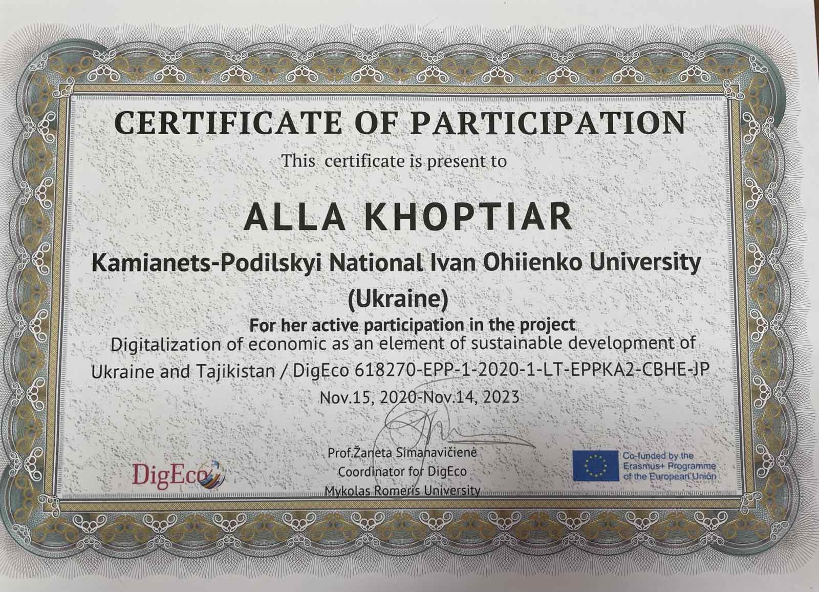 2018 – Cambridge Assessment English «Teaching Knowledge Test» (сертифікат); 2018-2021 Координатор програми Active Citizens, British Council in Ukraine в К-ПНУ;