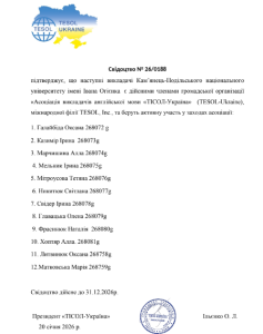 | Членство науково-педагогічних працівників кафедри англійської мови в громадській організації “Асоціація викладачів англійської мови “ТІСОЛ Україна” (TISOL Ukraine) |